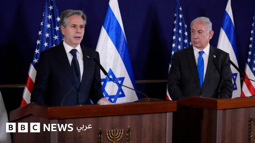 التعليق على الصورة، يقول بلينكن إن "ما تفعله إسرائيل في غزة ليس انتقاما، بل دفاع عن النفس"
