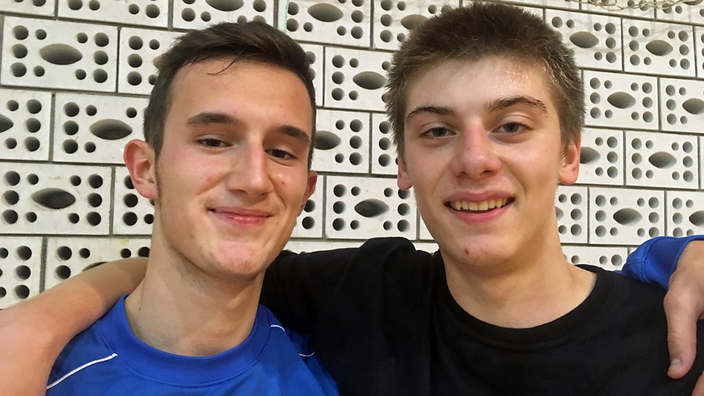 (PHOTO: Hevzi Imeri, an ethnic Albanian and Danilo Dabetic, a Serb, play together at the basketball club Play 017 in Bujanovac – one of very few mixed activities for young people in Serbia’s Presevo Valley. BBC photo.)
