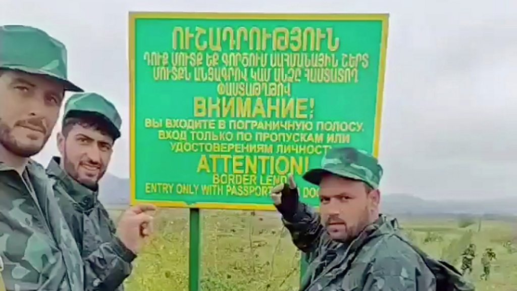 (Image: Men in the same fatigues as SNA fighters photographed in Azerbaijan stand in front of a border sign written in Armenian, Russian and English. Credit: Telegram channel of Jarablus News)