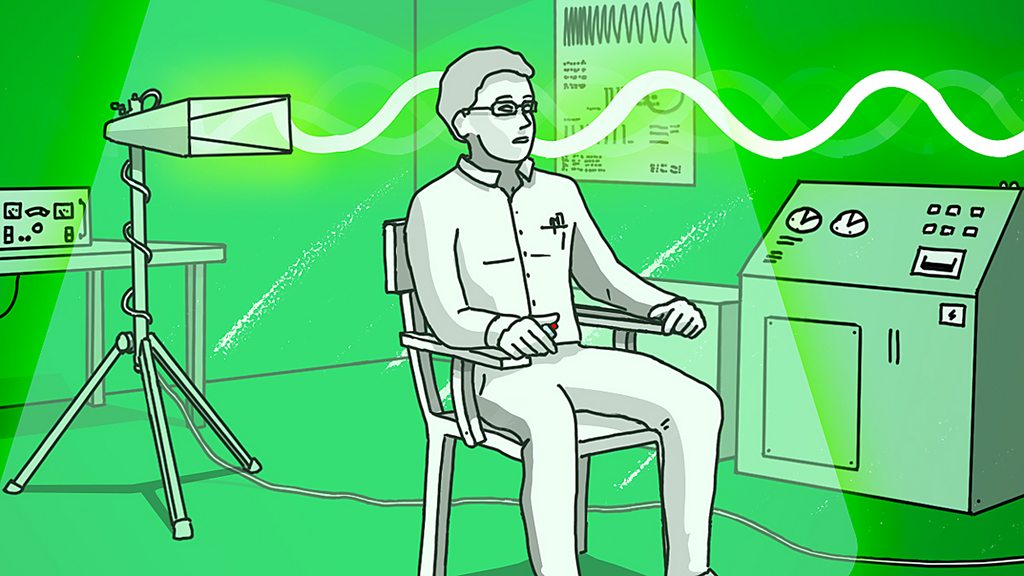 (Image: Illustration of a man sitting in a chair in a laboratory, a device behind him pulsing wavy beams of microwave energy through his head. Credit: BBC/Gerry Fletcher)