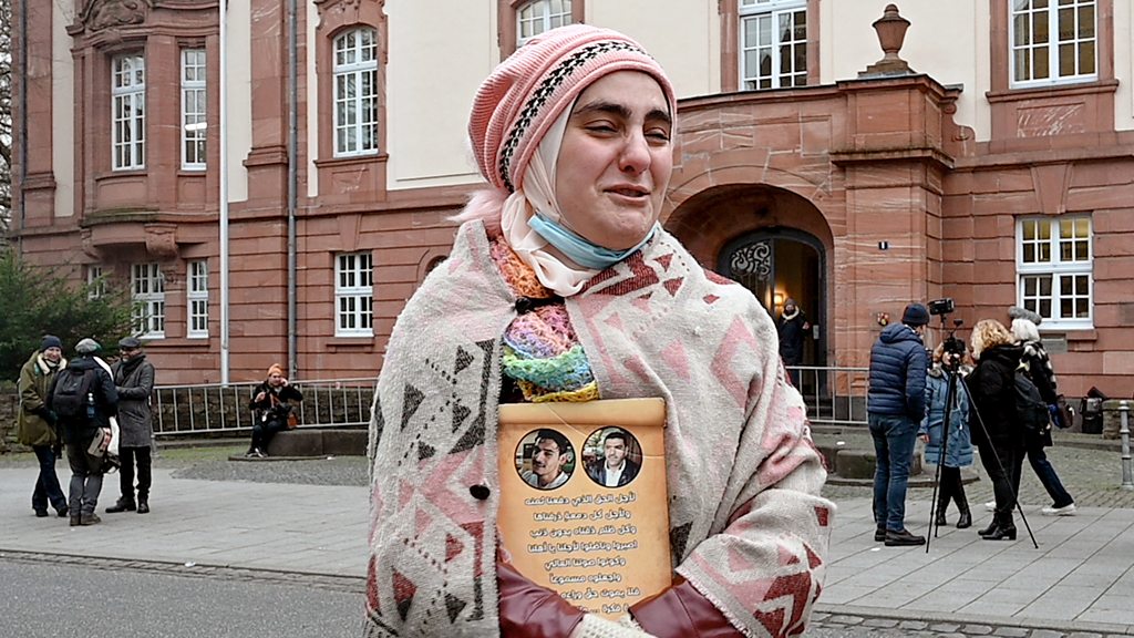 (Image: A woman shows a picture of her Syrian relatives outside the Higher Regional Court in Koblenz, Germany, 13 January 2022. Credit: EPA/Sascha Steinbach)