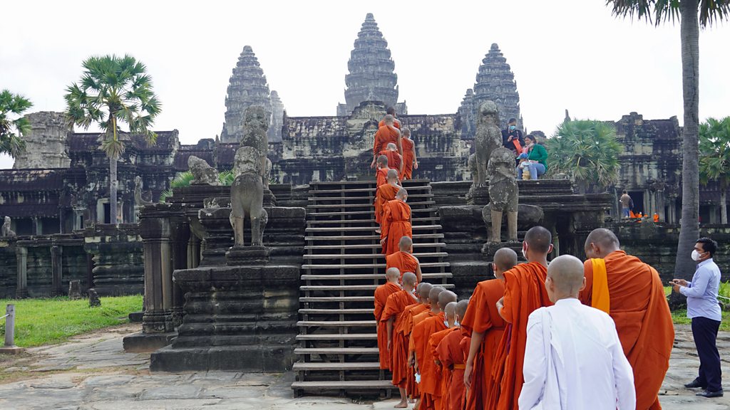 (Image: Monks at Angkor Wat temple, Cambodia. Credit: BBC)