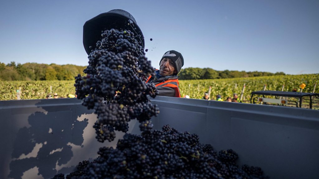 (Image: A picker throws the collected grapes from the vine in a tank at the Gusbourne Estate, Appledore near Ashford, England on October 28, 2022. Credit: Getty Images)