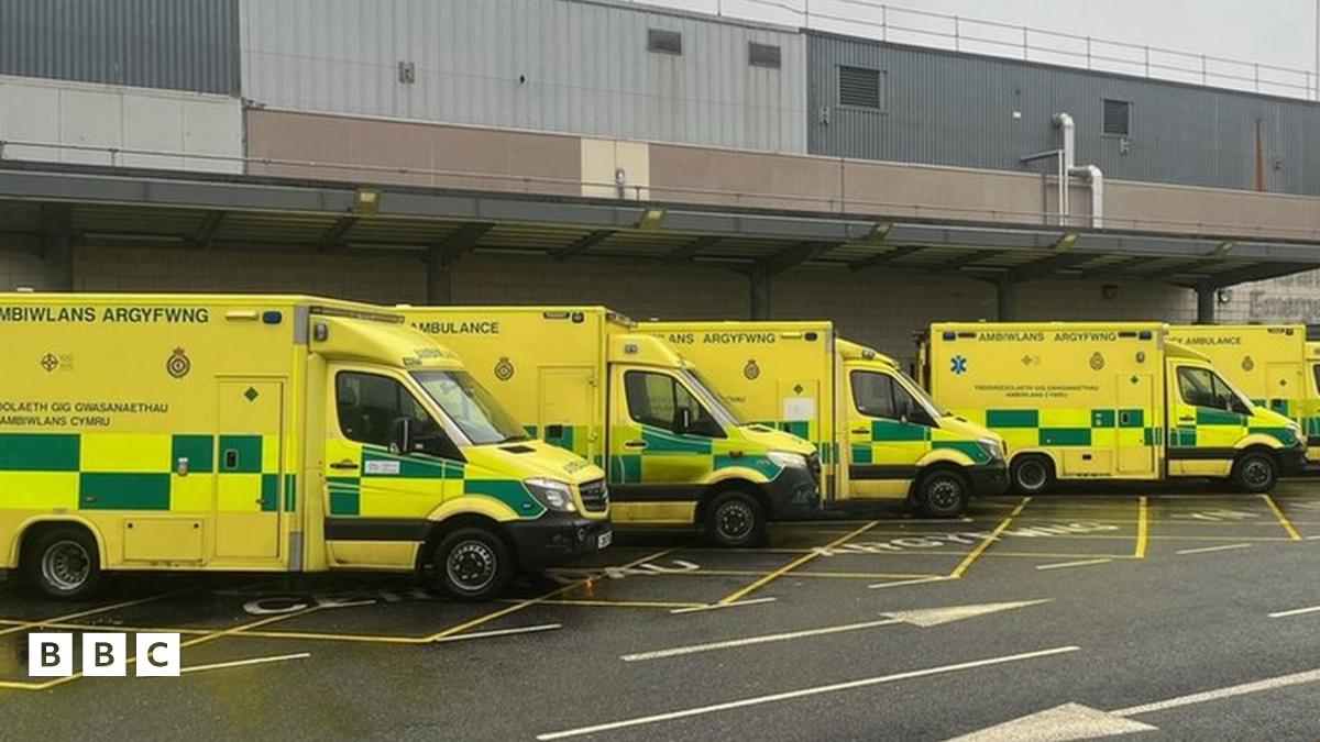 Roedd rhes o ambiwlansys i'w gweld yn disgwyl tu allan i adran frys Ysbyty Gwynedd ddydd Mawrth yr wythnos hon