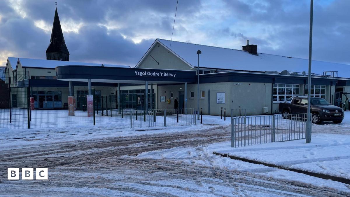 Yr olygfa yn Ysgol Bro Preseli - un o'r degau o ysgolion sydd ynghau ar draws y wlad