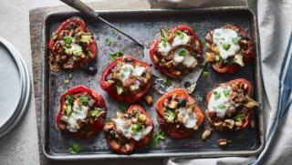 These veggie stuffed peppers are full of colour and flavour for a satisfying vegetarian midweek meal – the perfect option if you’re trying to eat less meat.