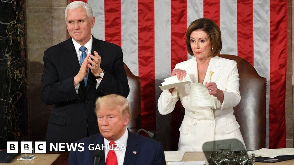 Nancy Pelosi, umukuru w'inteko ishingamategeko, yatabuye kopi y'ijambo rya Bwana Trump ubwo yari ari kuri 'podium' ahavugirwa amagambo.