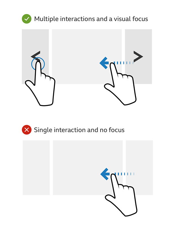 For example, providing a button style alternative to a gesture control enables people new to touch screens, and also those using a switch or screen reader.