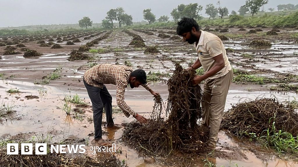 ઇમેજ કૅપ્શન, માવઠા દરમિયાન અમરેલીના મોટા અગરિયા ગામે 30 ઓક્ટોબરે વરસાદમાં સડી રહેલ પોતાની મગફળી તપાસી રહેલ ખેડૂતો