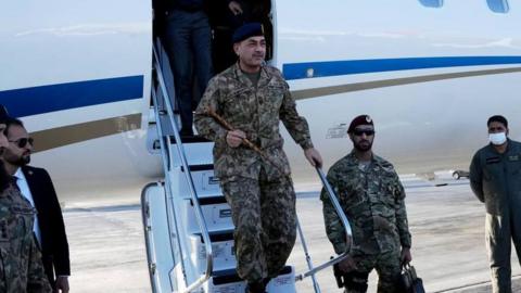 इमेज कैप्शन, पाकिस्तान का एक प्रतिनिधिमंडल ईरान पहुंचा है, जिसमें आसिम मुनीर भी शामिल हैं