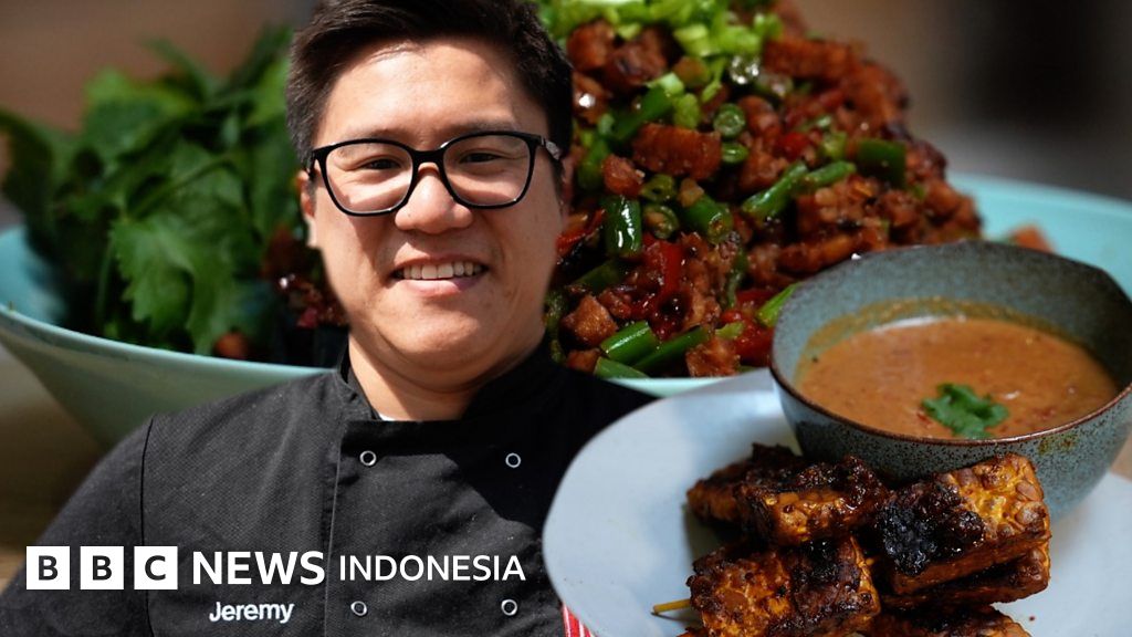 “Tempe sangat serba guna dan bisa dicampur dengan berbagai bumbu, selain memberi rasa manis alami dalam menu masakan,” kata Jeremy yang mengajak BBC memasak dua resep, sate tempe dan terong disiram sambal tempe.