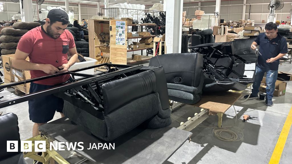 メキシコ北東部モンテレイにあるマンワ(敏華)家具工場の製造ラインから出てくるリクライニングチェアや豪華や革張りのソファは、100%「メイド・イン・メキシコ」だ。
