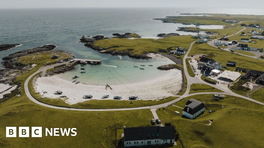 Getty Images An aerial view of a small sandy bay and harbour in Tiree. The low-lying, grassy landscape around the bay is dotted with houses and other buildings.Getty Images