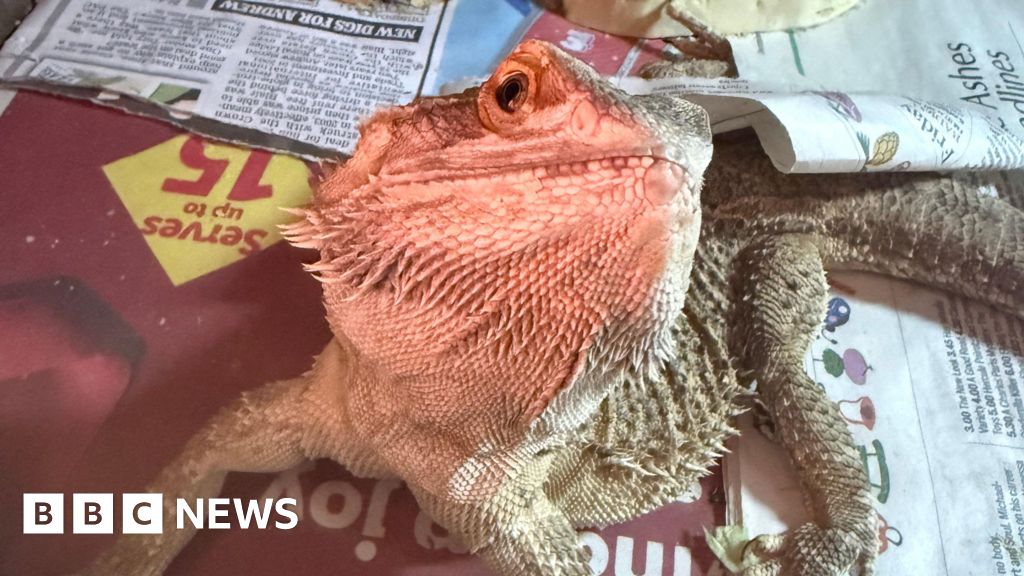 Sussex Reptile Centre A green bearded dragon with a red face sits on newspapers.Sussex Reptile Centre