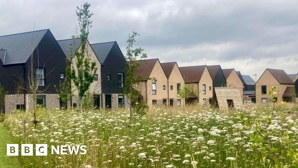 Mousumi Bakshi/BBC A row of new-build houses with a green meadow in front of them. There are flowers and grass in the meadow. The houses are made of brick with gabled roofs. There are a few trees and the sky is grey. Mousumi Bakshi/BBC