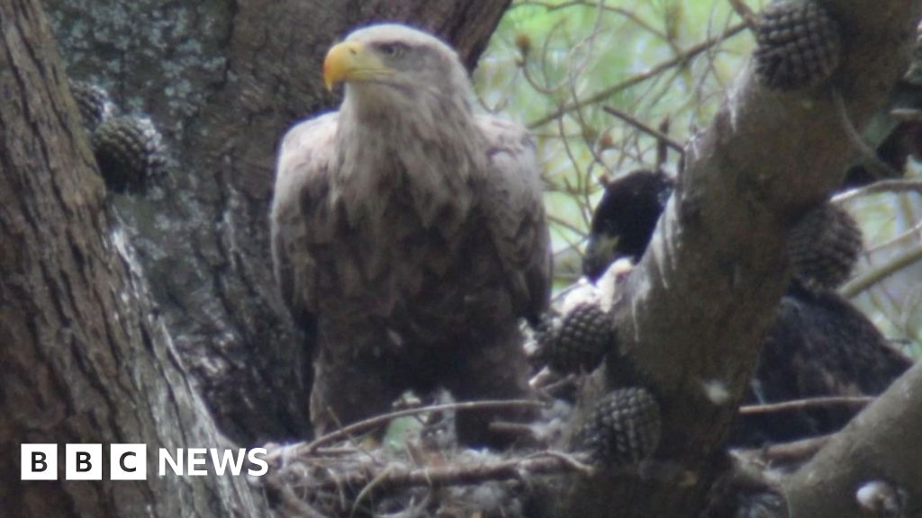 Forestry EnglandThree white-tailed eagles have fledged from two wild nests in England, making it a record year for the species.