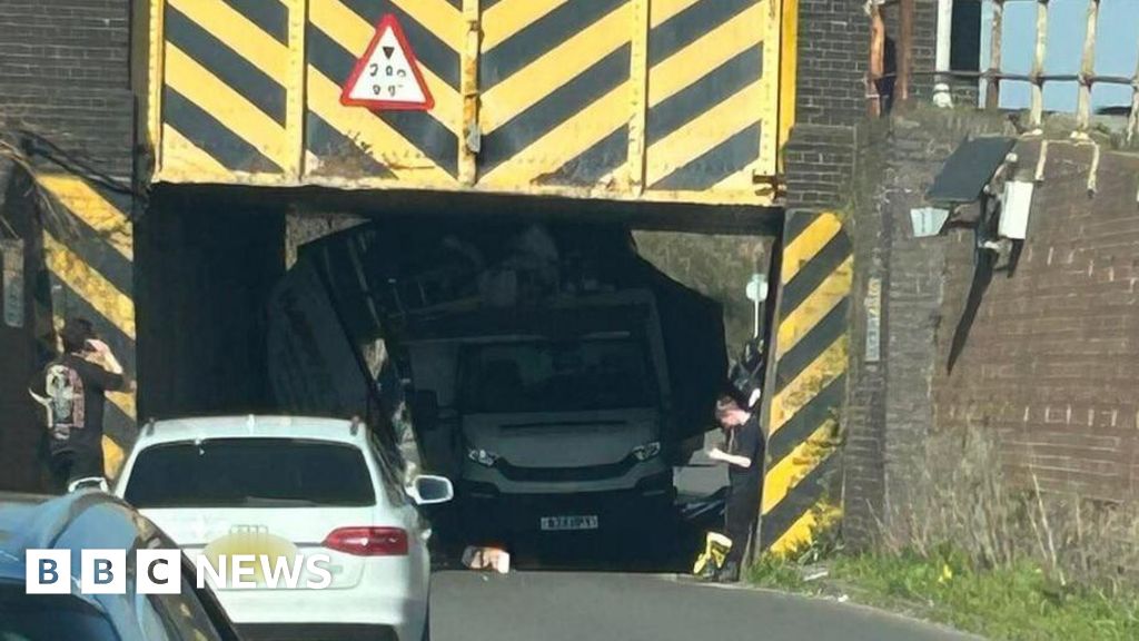 Lee TuckerA road had to be closed off after a removal van struck a railway bridge and became wedged underneath.