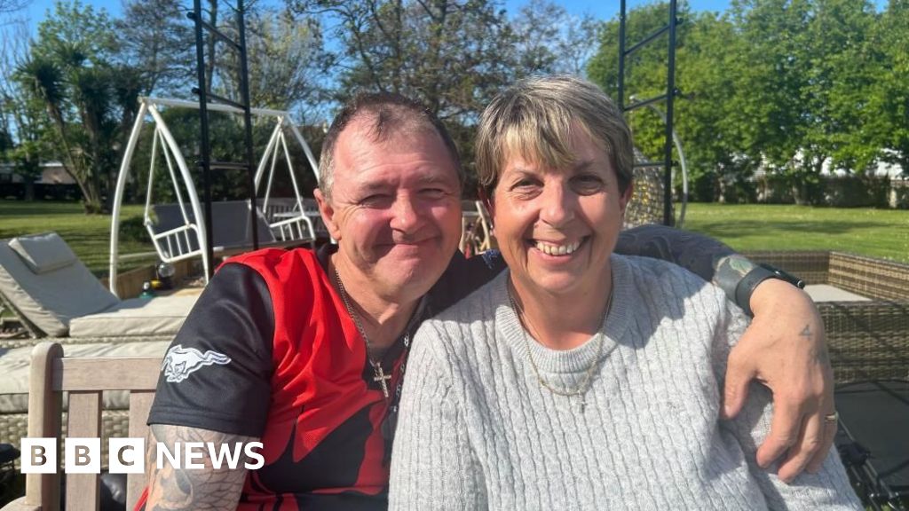 BBC A man in a red and black T-shirt with tattoos on his arm hugs a woman in a grey jumper while both smile at the camera. In the background there is a grey outdoor seating setting and green grass. BBC