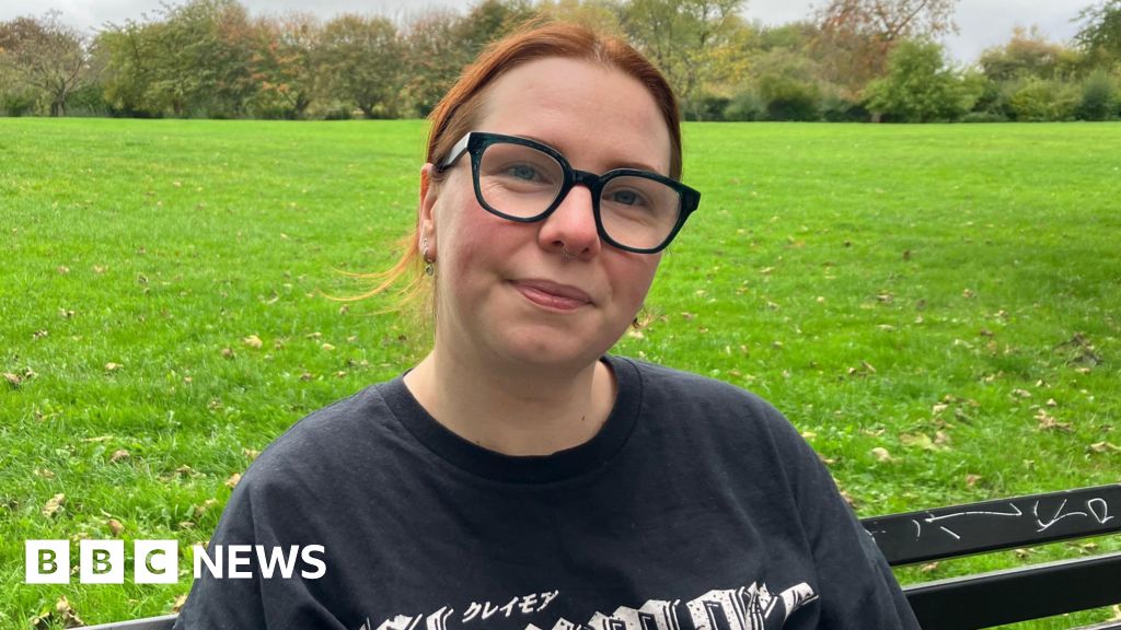 Sofia Luis-Hobbs/BBC A woman sitting on a park bench. She is wearing a black t-shirt with white writing. She has glasses and ginger hair. In the background, there is grass and trees.Sofia Luis-Hobbs/BBC
