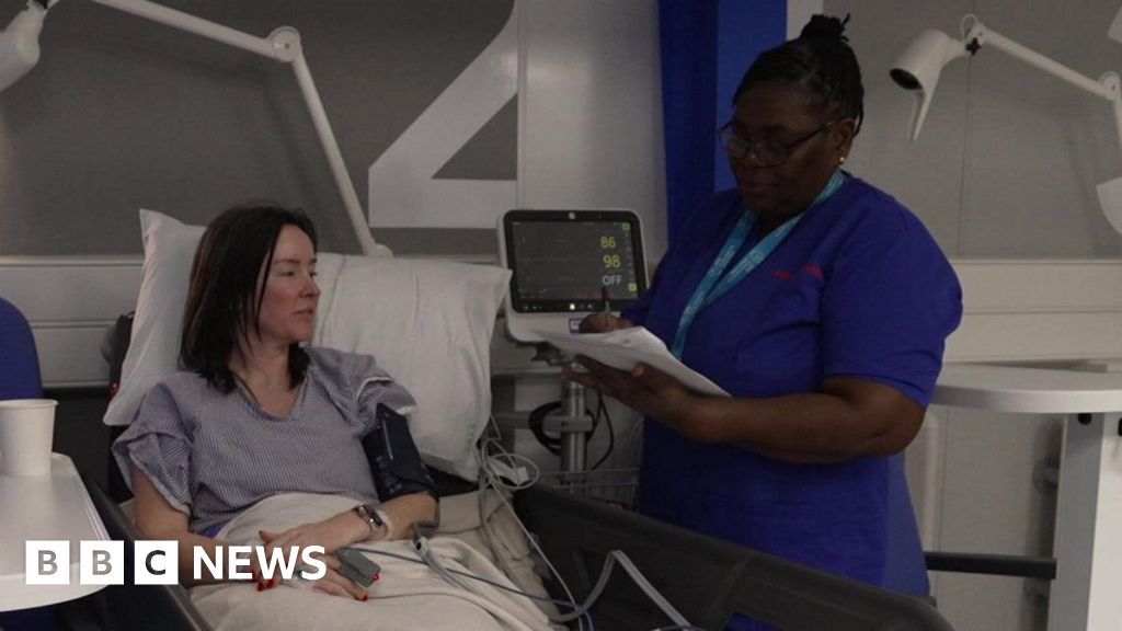 BBC A female patient in a hospital bed is attended by a female nurse who is writing on a sheet of paper. A hospital monitor is checking the patient's blood and heart function.BBC