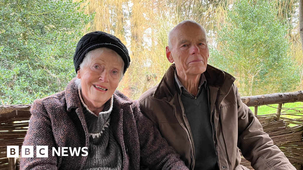 Clare Worden/BBC Coral and Ernest Hoyos sit in a small wooden hut behind them are mature trees in a range of greens, oranges and browns. They are in their 80s and Coral is wearing a black hat and purple coat. Ernest is wearing a brown coat. Clare Worden/BBC