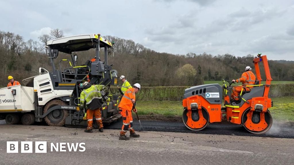 BBC A road with obvious cracks is being laid with fresh tarmac by a large white machine. It is being rolled over by a large bright orange roller, driven by a man in orange high visibility clothing. There are several workmen wearing high visibility clothing and hard hats, sweeping the tarmac. There is a green grass verge and a hedgerow next to the road.BBC