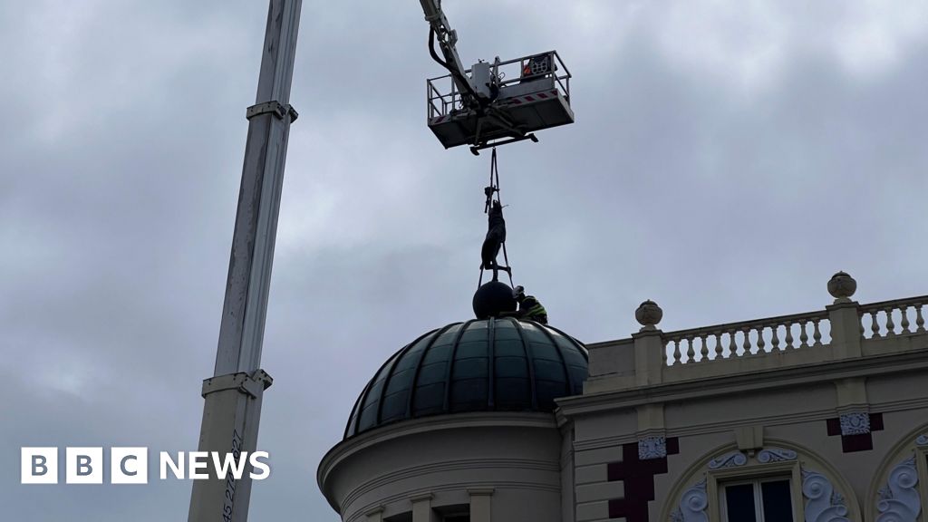 BBC/Aaron OutramA well-known statue which adorned the top of a Sheffield theatre has returned after undergoing "extensive" repairs.