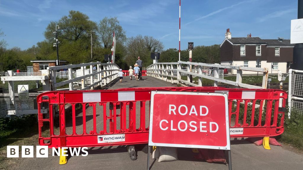 BBC A swinge bridge over a canal that is blocked off with a sign saying 'road closed'. There are four people along the bridge, one adult man and three children. There are trees on the other side of the bridge and a brown and white building. BBC