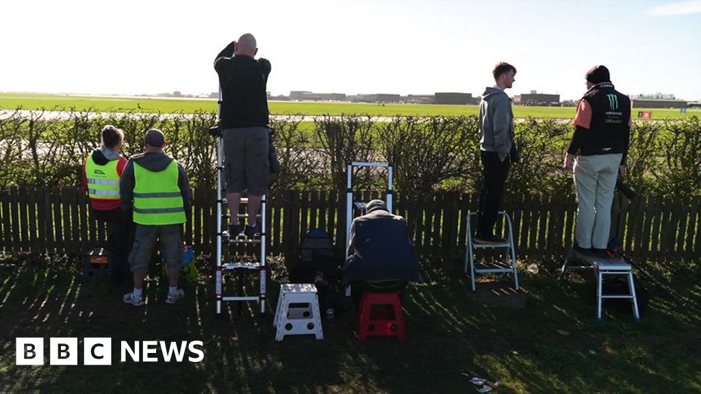 BBC Plane spotters stand on ladders by the runway at RAF WaddingtonBBC