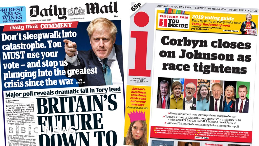 "Corbyn closes on Johnson as race tightens" declares the i newspaper, which in common with the Times says the prime minister can't be sure of securing a Commons majority.