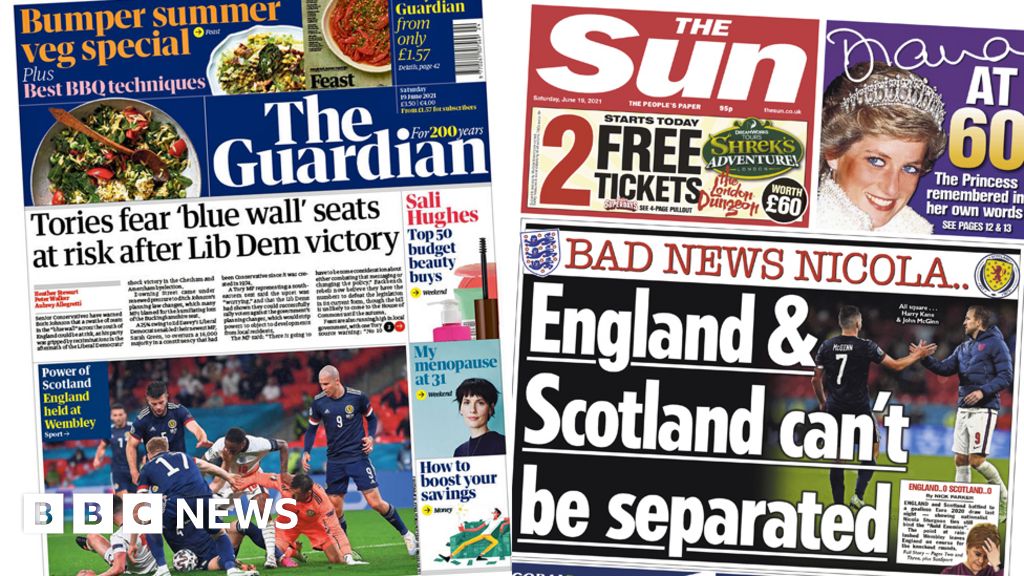 A combination of two stories - one the Tory defeat in the Chesham and Amersham by-election, the other England and Scotland's draw in the European Championships - accounts for many of the front pages.