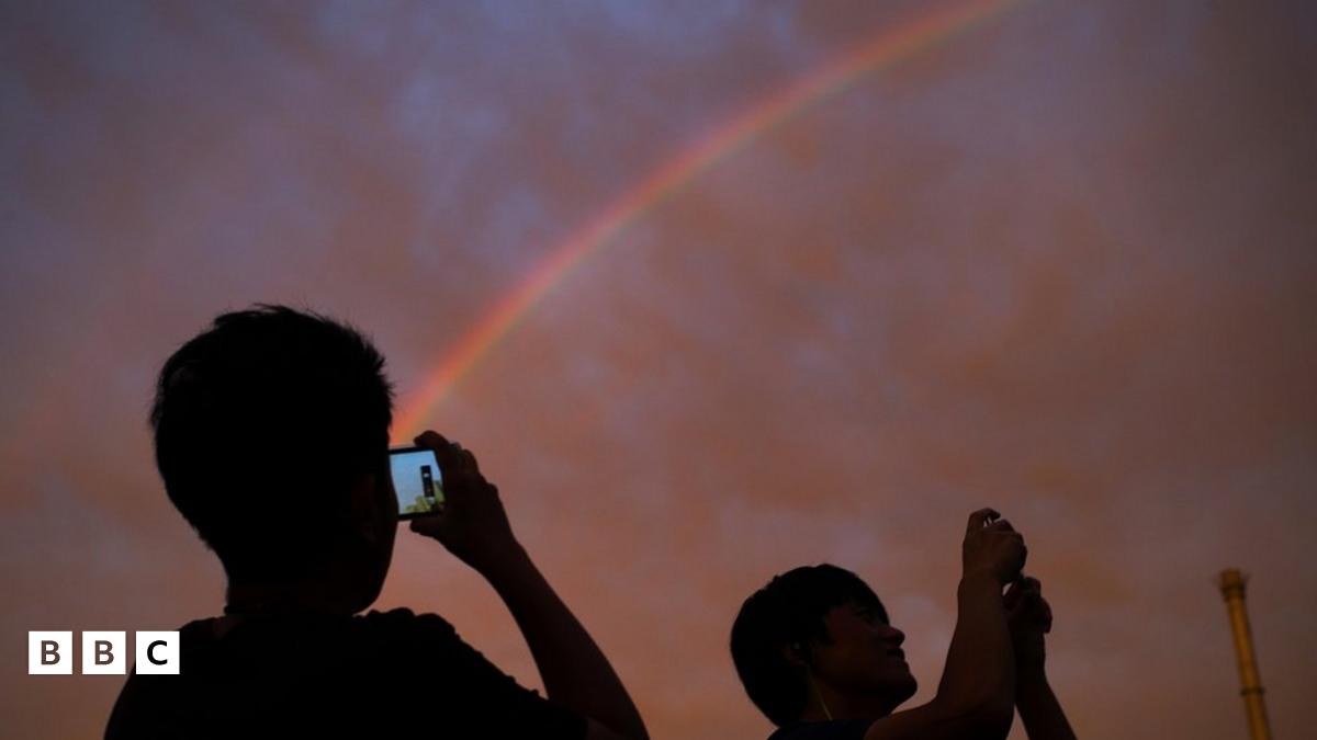 Passersby take photos of a rainbow at sunset in Beijing on Monday, 3 August, 2015Image source, AP