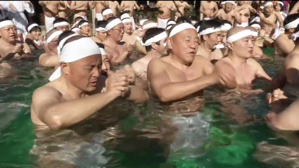 Hundreds of people have gathered in Tokyo, Japan, to take an icy dip as part of a 61 year tradition called the Shinto ritual.