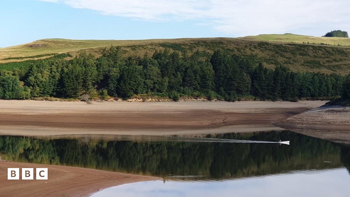 Ffermdy yn ymddangos yn Llyn Brianne ger Llanymddyfri oherwydd y sychder diweddar