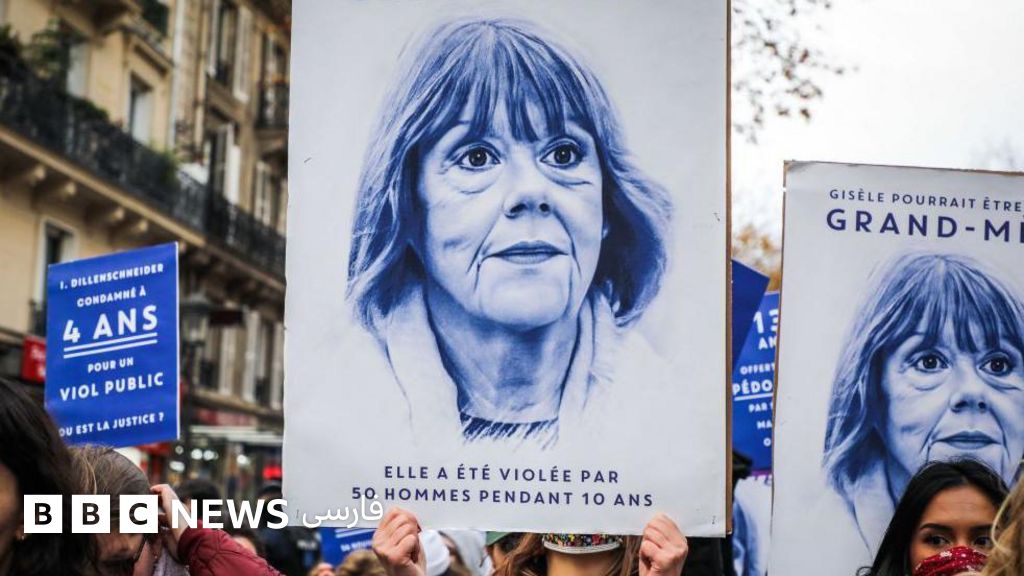 توضیح تصویر، معترضان گروه نمسیس در جریان تظاهرات در پاریس با پلاکاردی از چهره ژیزل پلیکو که روی آن نوشته شده «ژیزل می‌توانست مادربزرگ ما باشد؛ او طی ده سال، توسط ۵۰ مرد مورد تجاوز قرار گرفت»