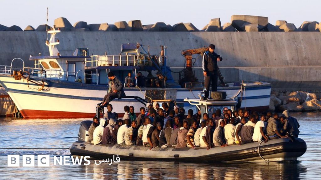 توضیح تصویر، قایق حامل پناهجویان و گارد ساحلی لیبی - در سال‌های اخیر گارد ساحلی تعداد قابل توجهی از مهاجران را از آب گرفته است