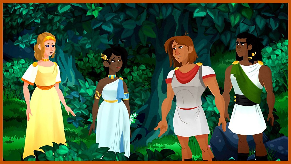 Demetrius and Lysander compete for Helena's love, and Hermia starts a fight.