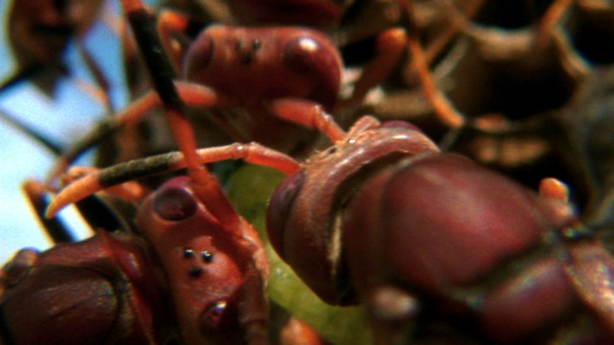 Paper wasps build their nests together and one female dominates the others to become queen. All the wasps hunt for caterpillars to feed the queen's larvae.