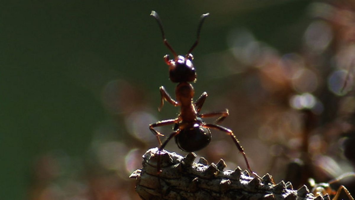 Wood ants build huge nests. They go hunting for prey, ganging up to attack creatures larger than themselves. David Attenborough gets them to demonstrate their defence mechanism - spraying formic acid. The ants also collect honeydew from aphids and take it back to their nest.