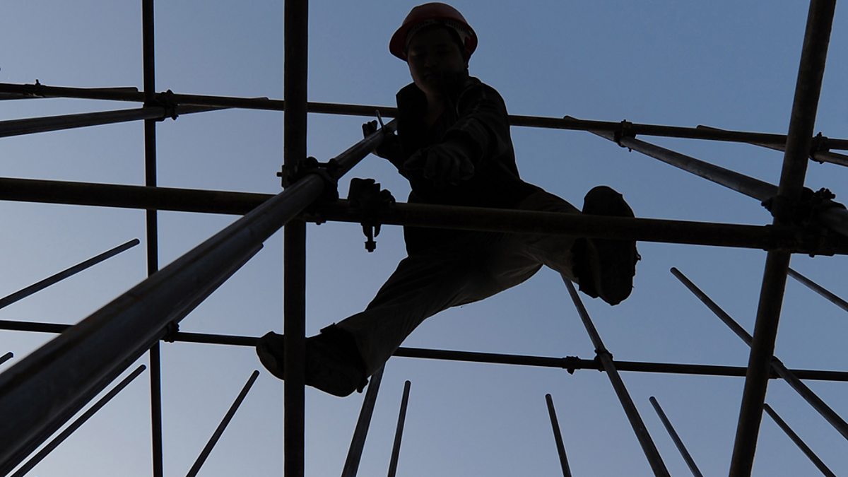 (Image: A worker standing on scaffolding at a construction site for a new shopping complex in Hefei, in eastern China. Credit: AFP/Getty)