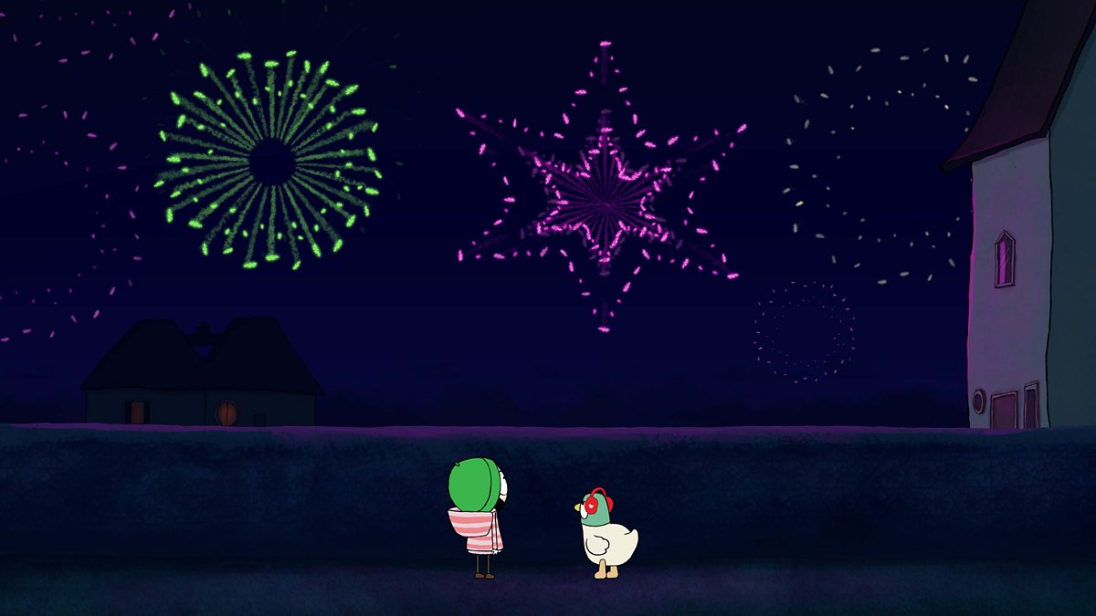 Mae'n noson Tân Gwyllt, a dydy Cwac ddim yn hoffi'r holl swn. It's Firework's Night and Cwac is not happy about all the noise.