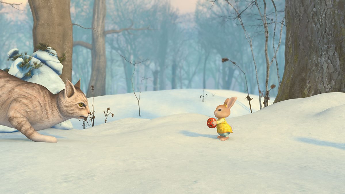 Mae Guto'n credu ei fod wedi llwyddo i ddod â llond trol o 'sgewyll adre', ond cath flin Mr Puw sydd yn y drol! Guto brings home Mr Puw's cat rather than a cart of freshly picked sprouts.