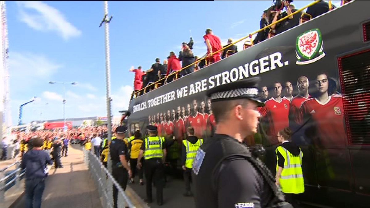 Y chwaraewyr yn cyrraedd Stadiwm Caerdydd ar gyfer y dathliadau.