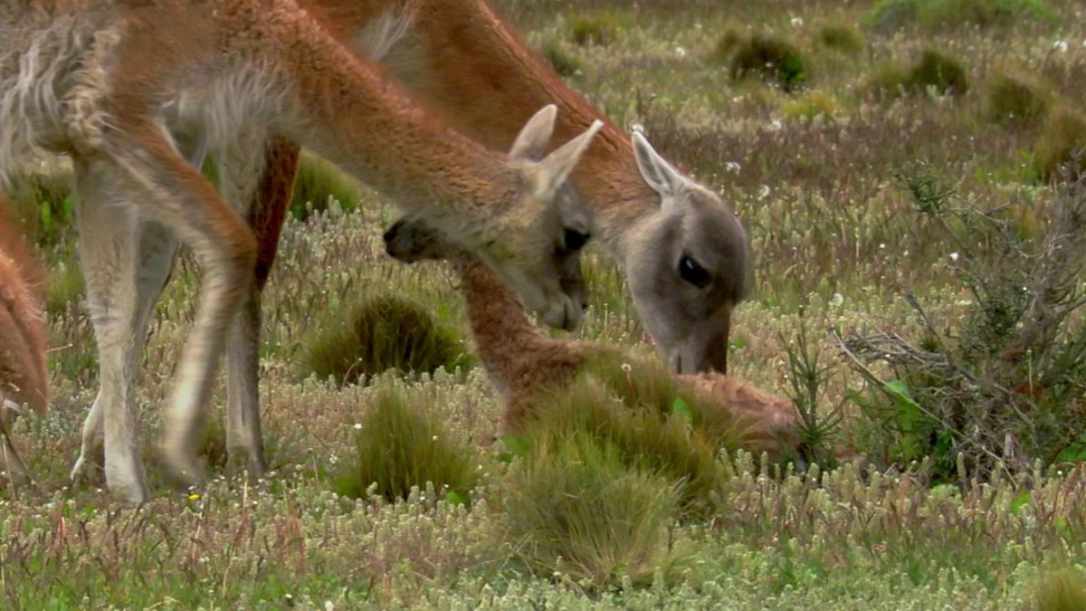 A baby guanaco, wild ancestor of the llama, is born in the mountains of Patagonia, it's first challenge is simply standing up.