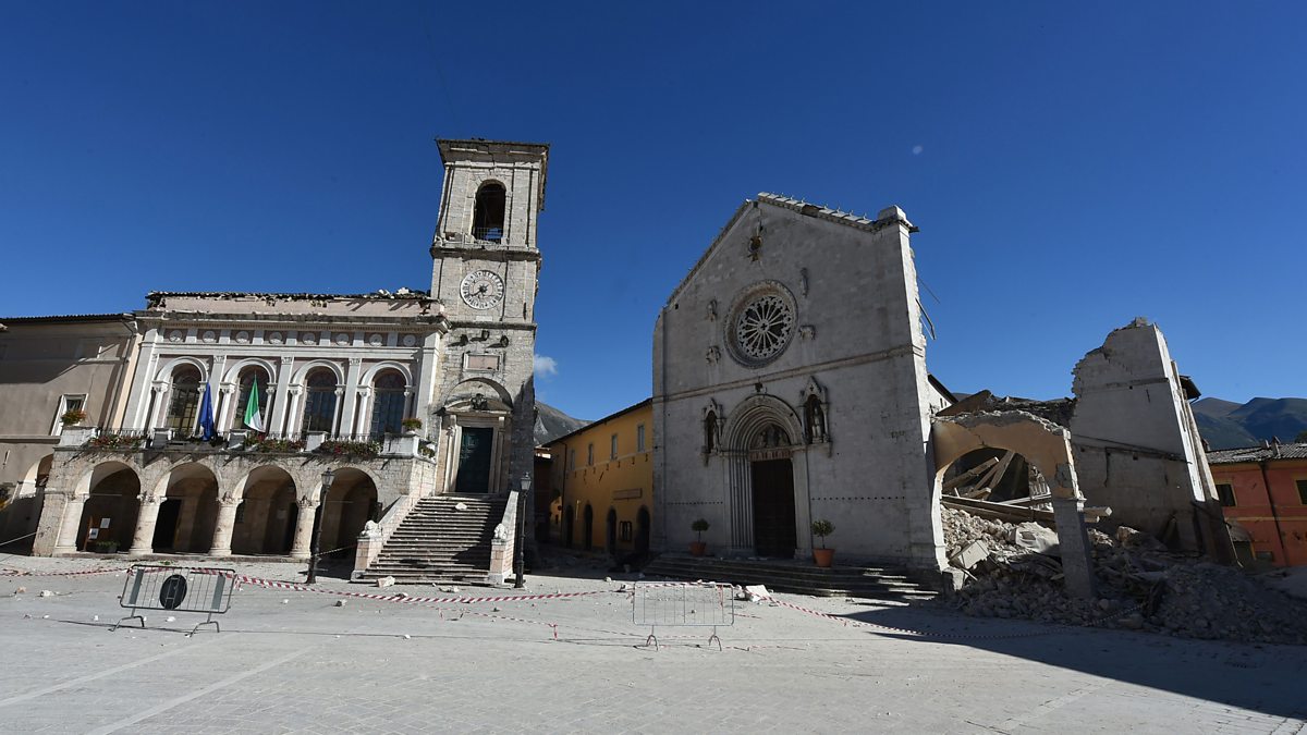 Picture: Destroyed basilica St Benedict (R) and the town hall (L) in the historic center of Norcia, on October 31, 2016, taken a day after a 6.6 magnitude earthquake hit central Italy, credit: Alberto Pizzoli/AFP/Getty Images