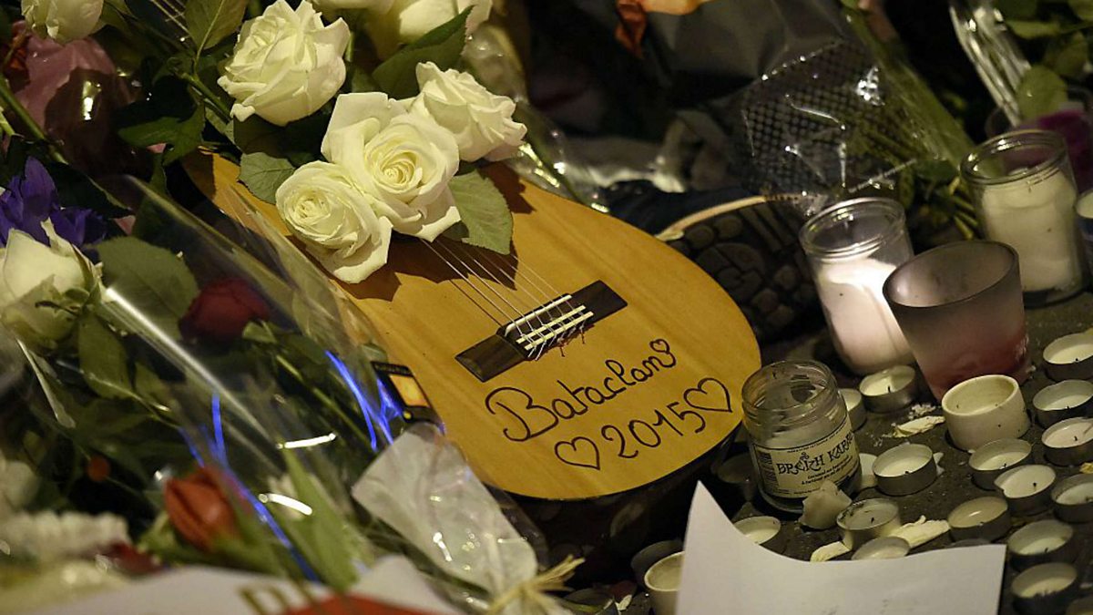(Photo: A guitar is seen among flowers and candle at a makeshift memorial in front of the Bataclan theatre Photo credit: FRANCK FIFE / Staff /Getty Images)