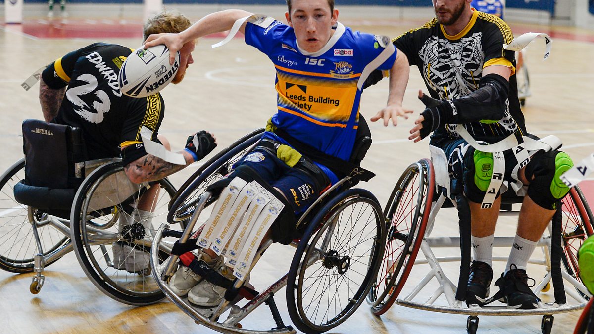 Coverage of the Wheelchair Rugby League Challenge Cup final between Leeds Rhinos and the Argonauts Skeleton Army of Kent.