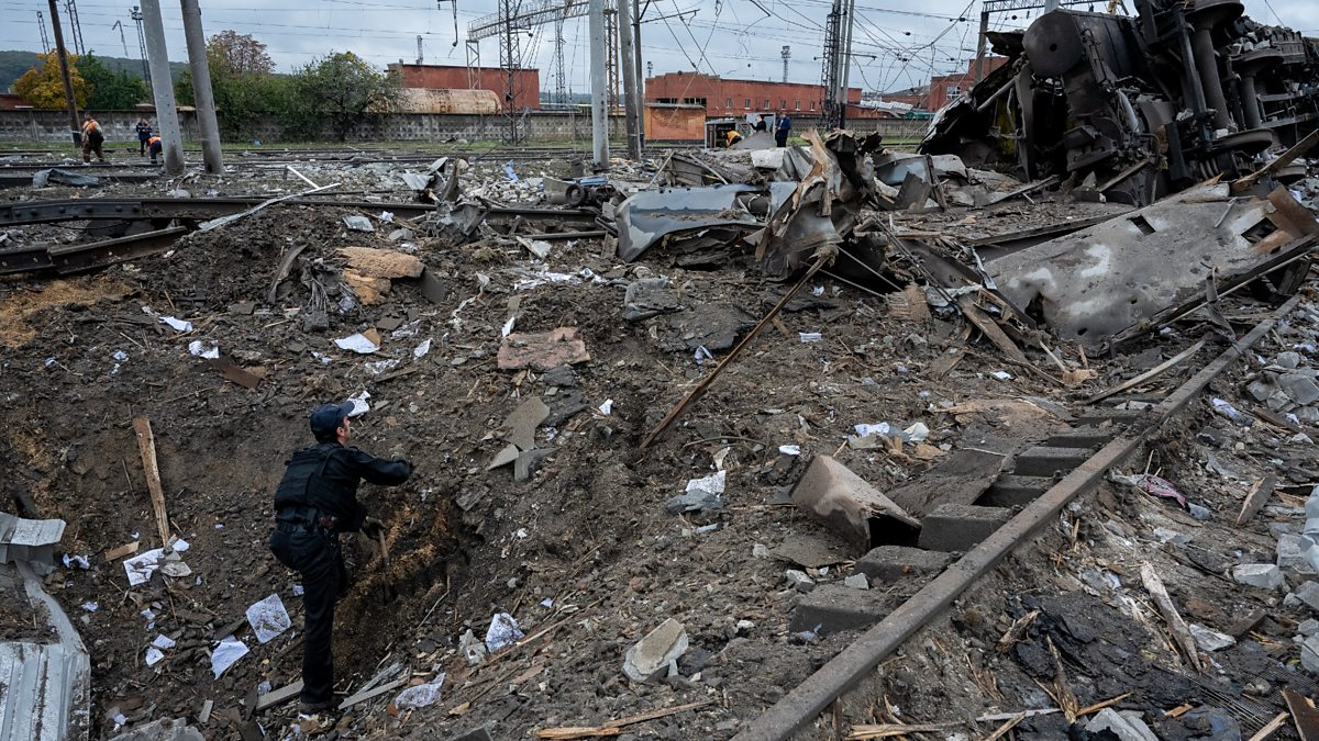 (Picture: Shows the aftermath of a Russian rocket attack on part of the rail network in Kharkiv on September 28th 2022. Credit: Scott Peterson / Getty Images.)