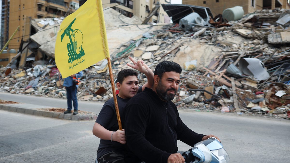 (Photo: A person gestures while holding a Hezbollah flag as they ride past a damaged building, after a 10-day ceasefire between Lebanon and Israel went into effect, in the southern suburbs of Beirut. Credit: Adnan Abidi/Reuters).