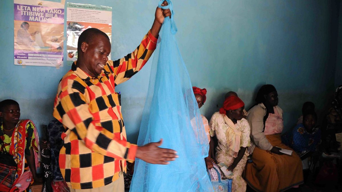 Image: Mosquito net demonstration in a community outreach centre in Kenya